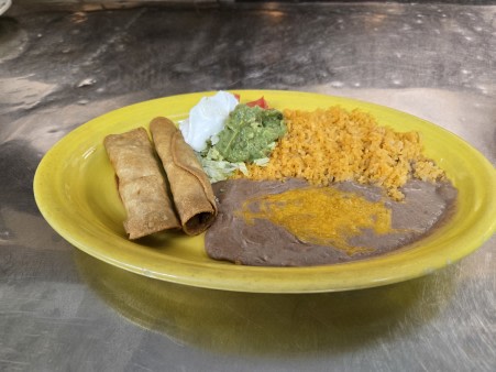 Fried corn tortillas, rolled with shredded chicken. Served with queso fresco, sour cream, guacamole, rice & beans | With guacamole and sour cream +$2.99