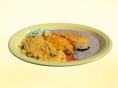 The following dinner combinations can be filled with: shredded chicken, ground beef, pork, or cheese. All combinations are served with rice & beans (whole or refried)